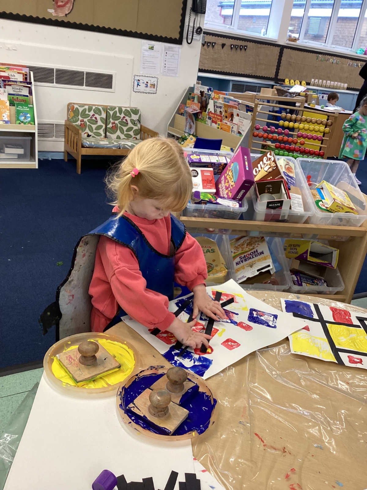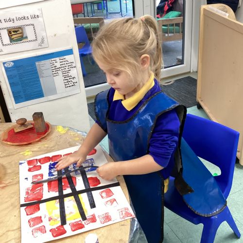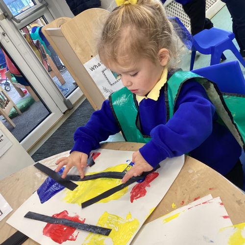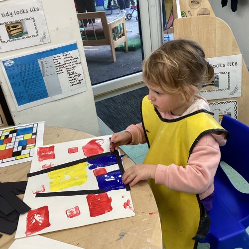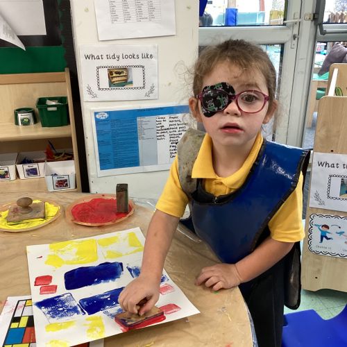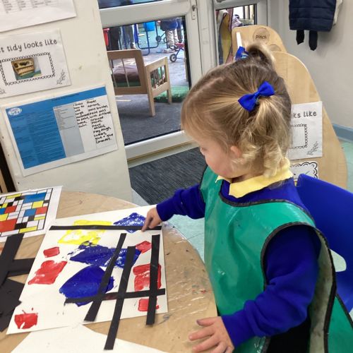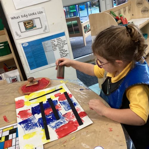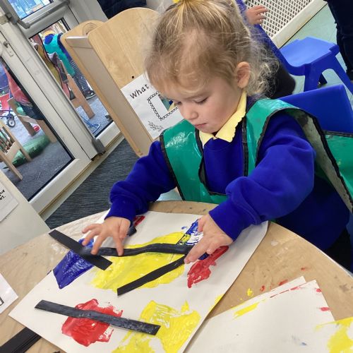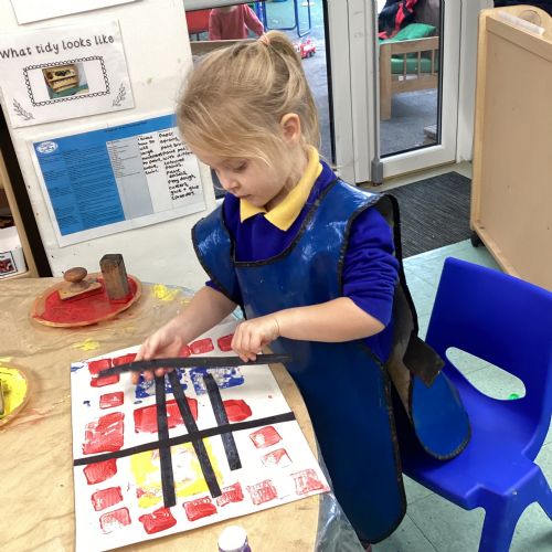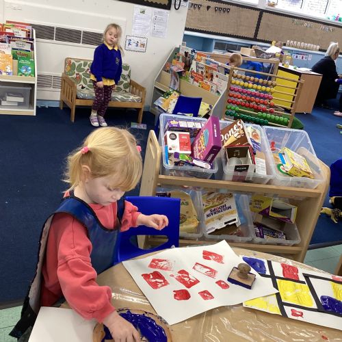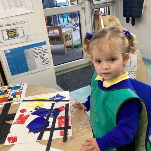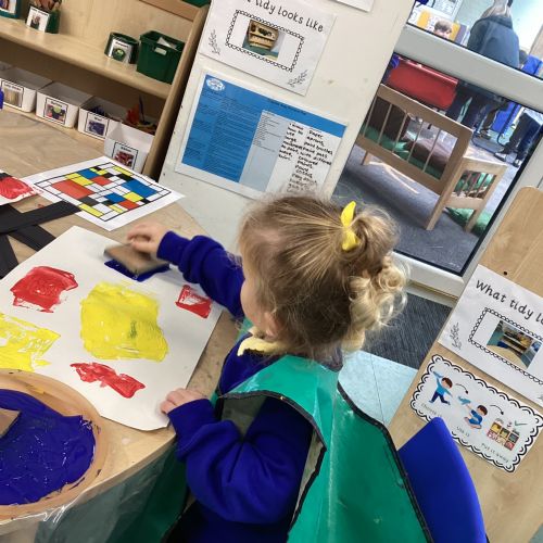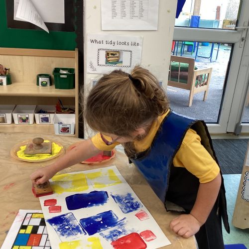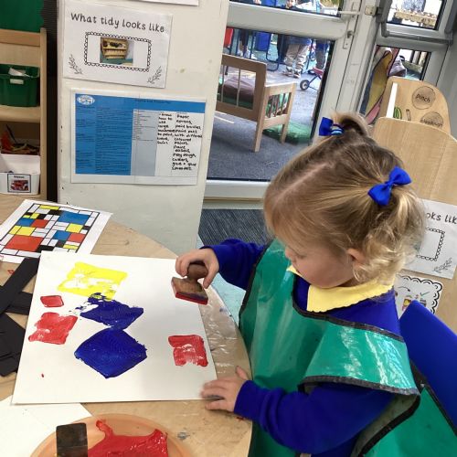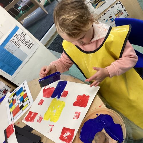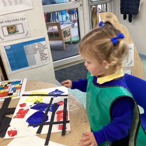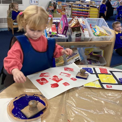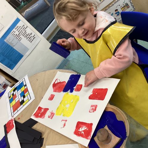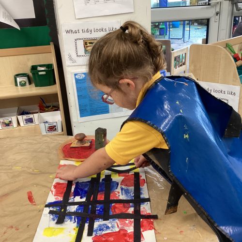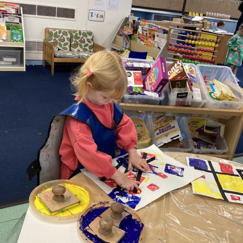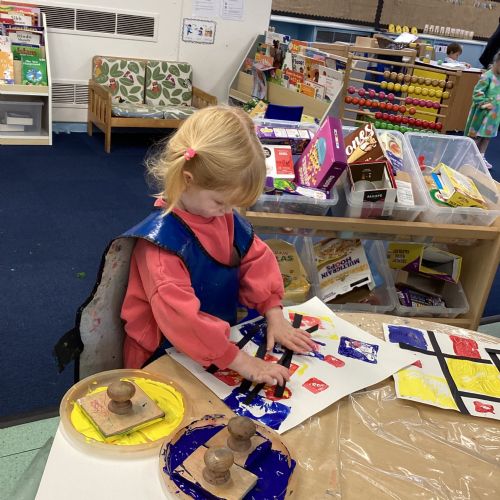 This week in nursery, we have been exploring the work of the famous artist Piet Mondrian! The children have been learning all about the primary colours, red, blue, and yellow and using them in their own creative artwork. We had lots of fun printing with squares and rectangles using paint. We also recreated Mondrian-inspired pieces using black lines and wax crayons. The children loved experimenting with shapes and colours and lines using a variety of different mark-making materials and tools.