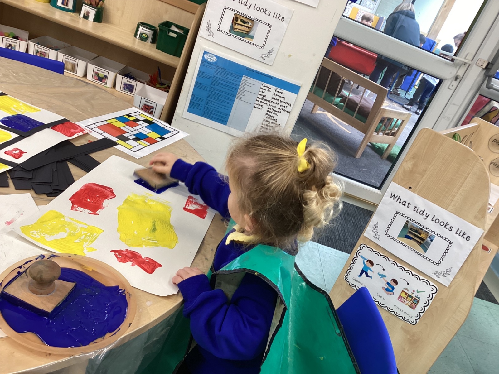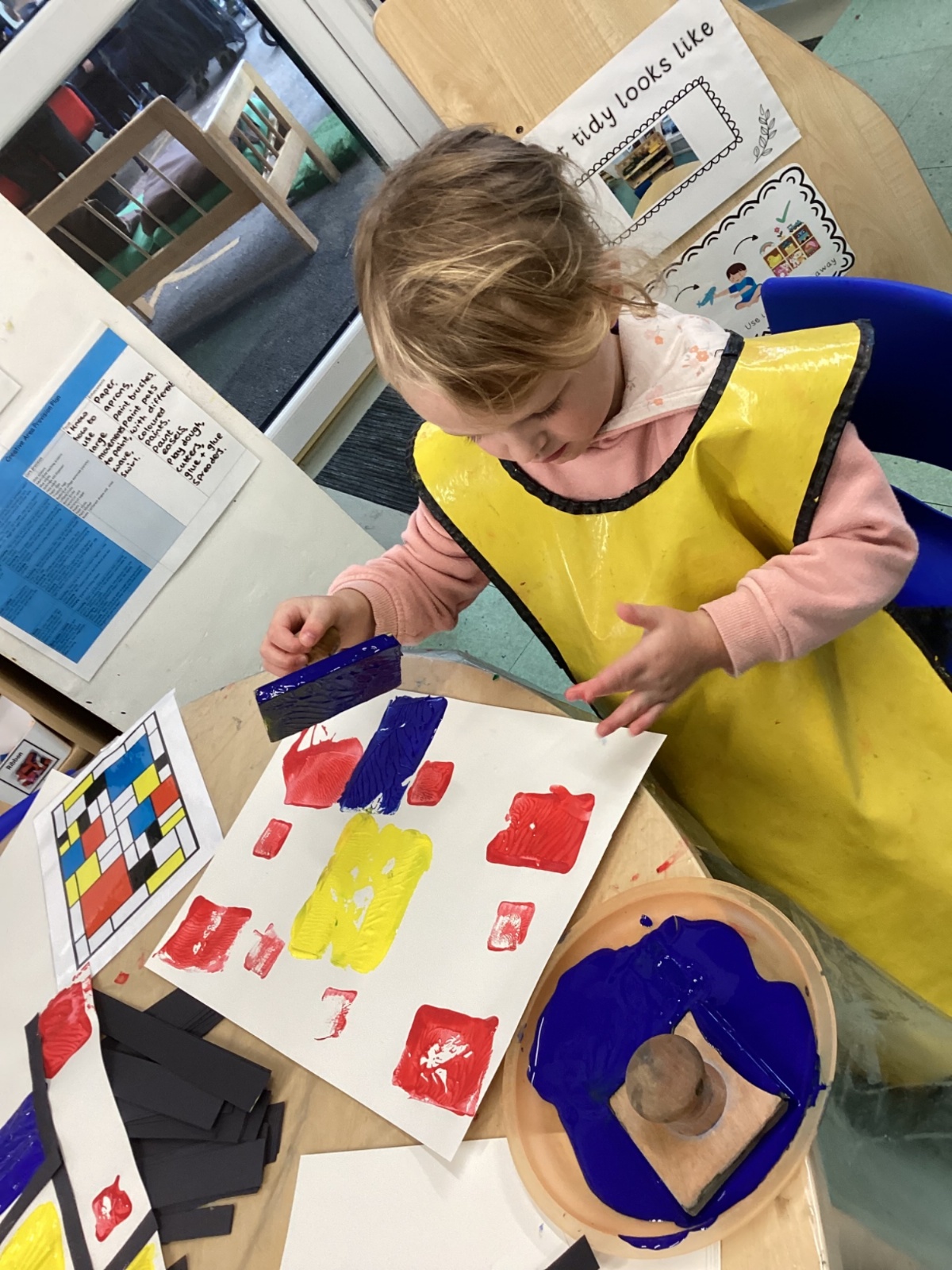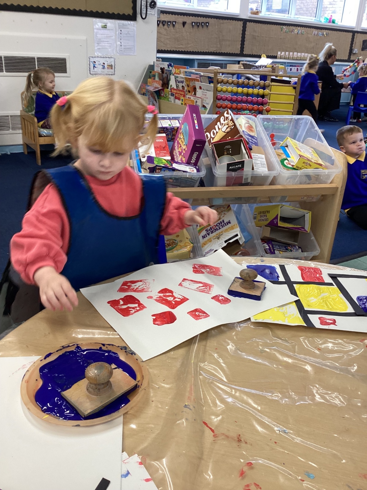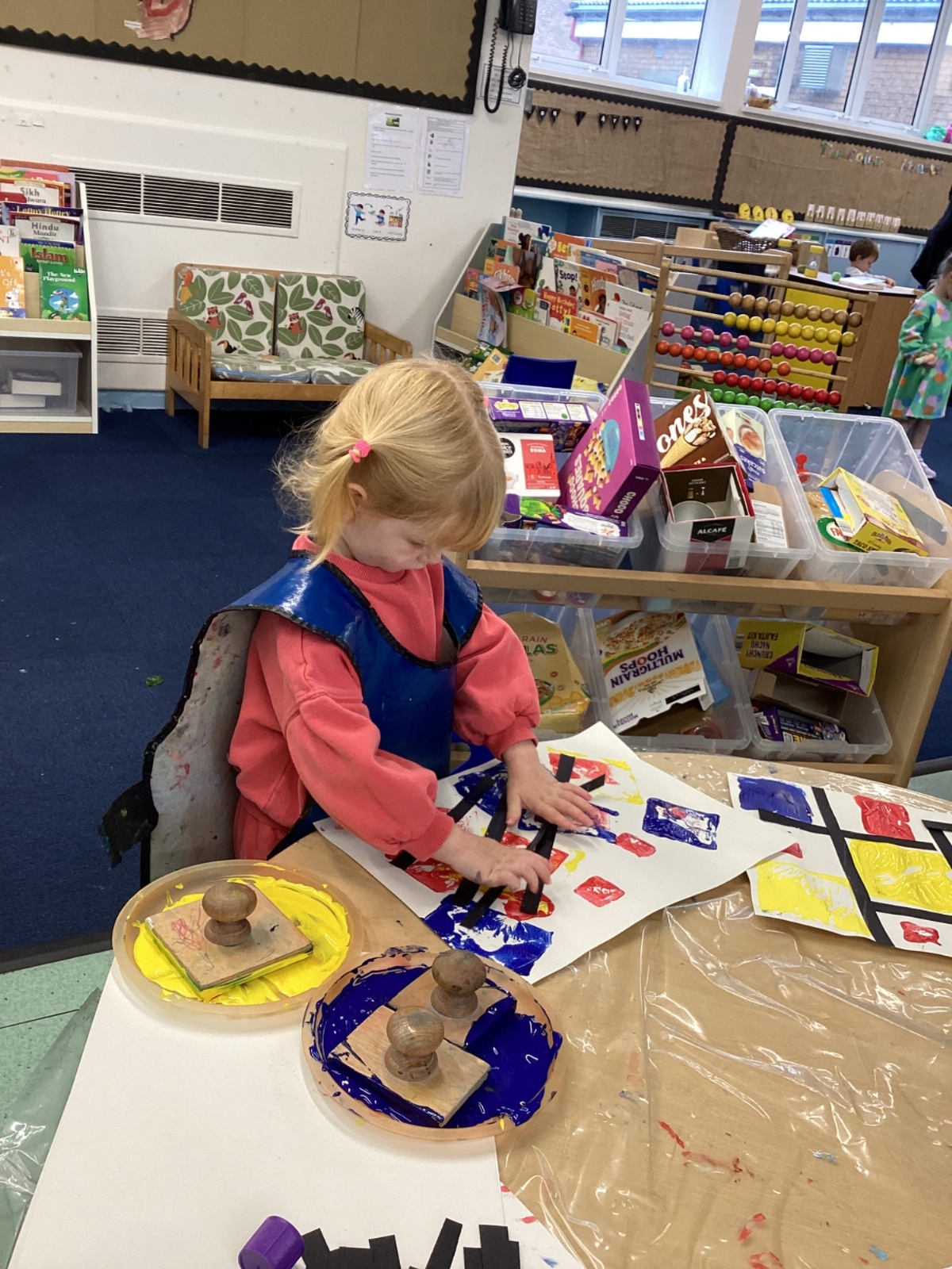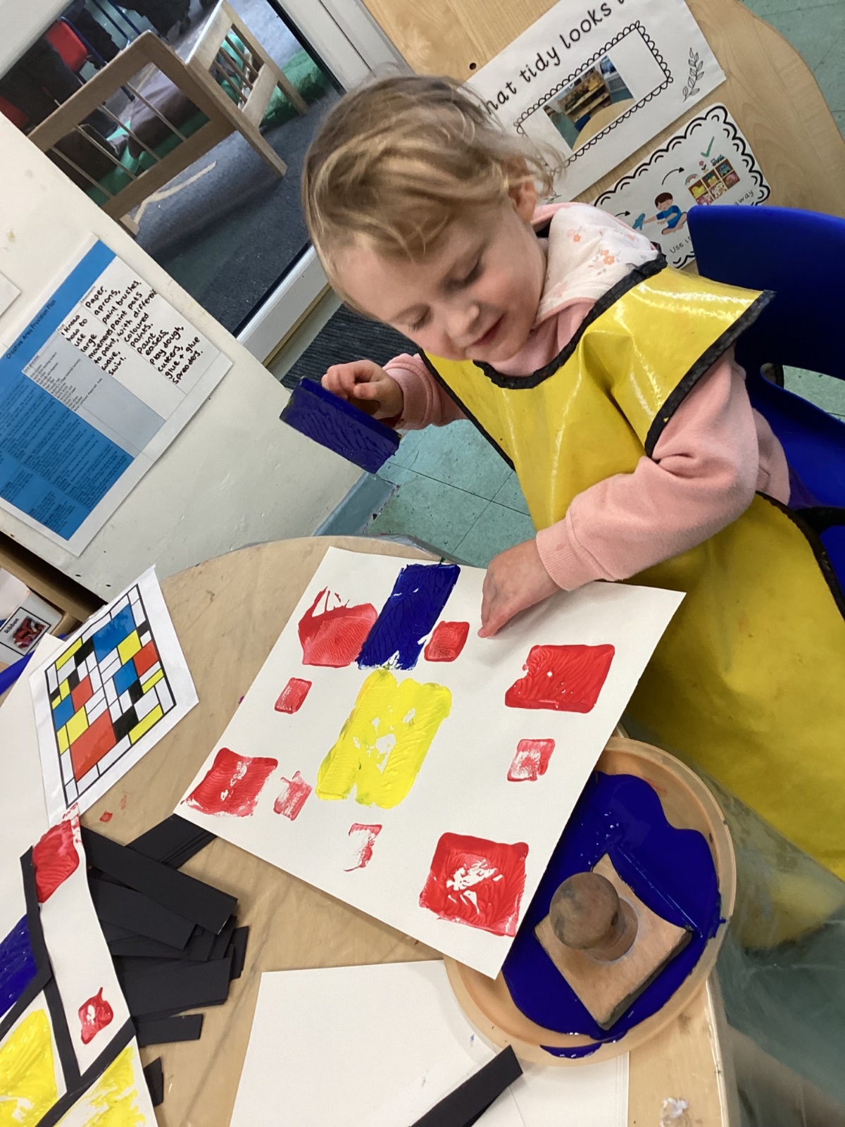 This week in nursery, we have been exploring the work of the famous artist Piet Mondrian! The children have been learning all about the primary colours, red, blue, and yellow and using them in their own creative artwork. We had lots of fun printing with squares and rectangles using paint. We also recreated Mondrian-inspired pieces using black lines and wax crayons. The children loved experimenting with shapes and colours and lines using a variety of different mark-making materials and tools.