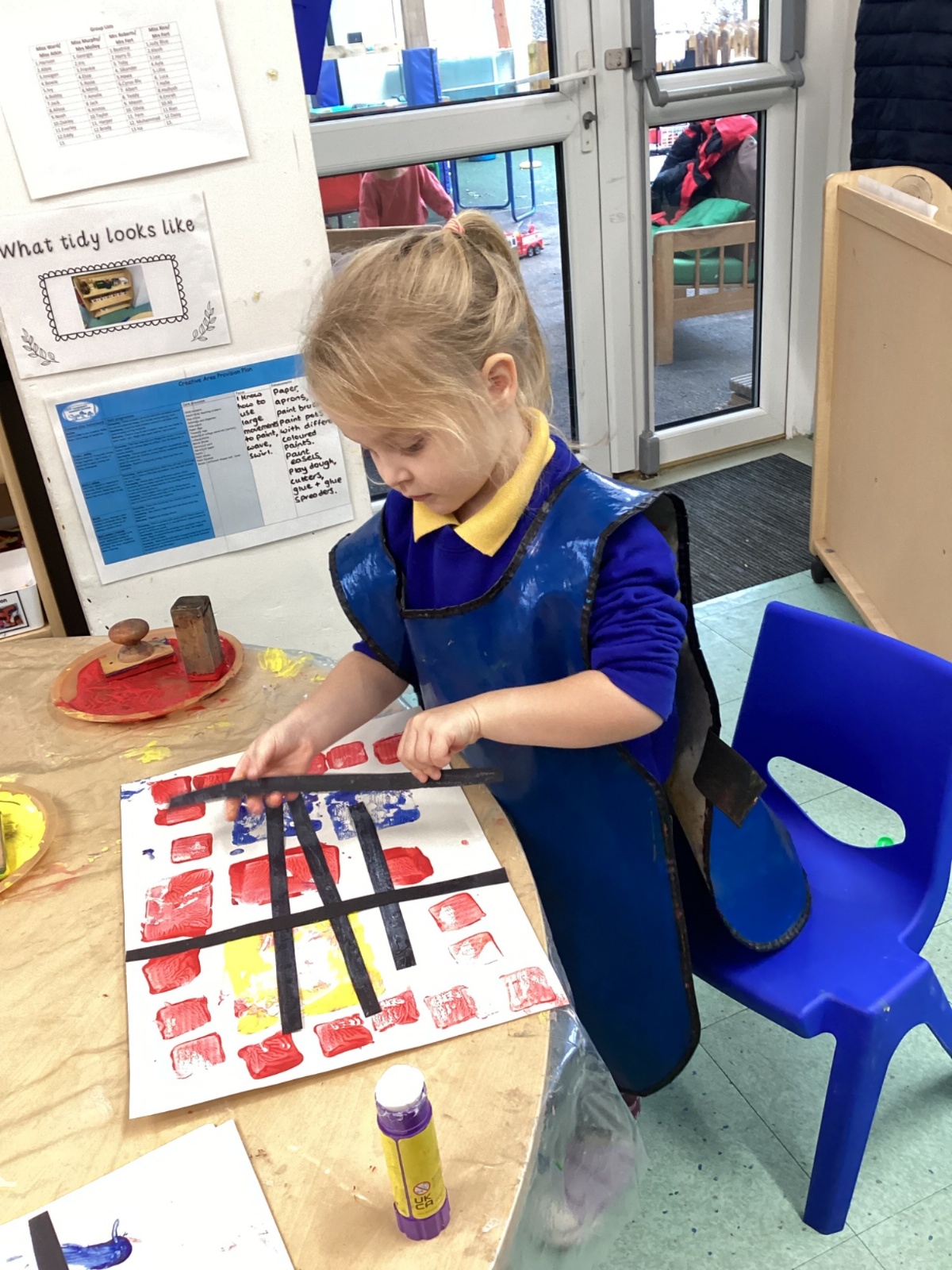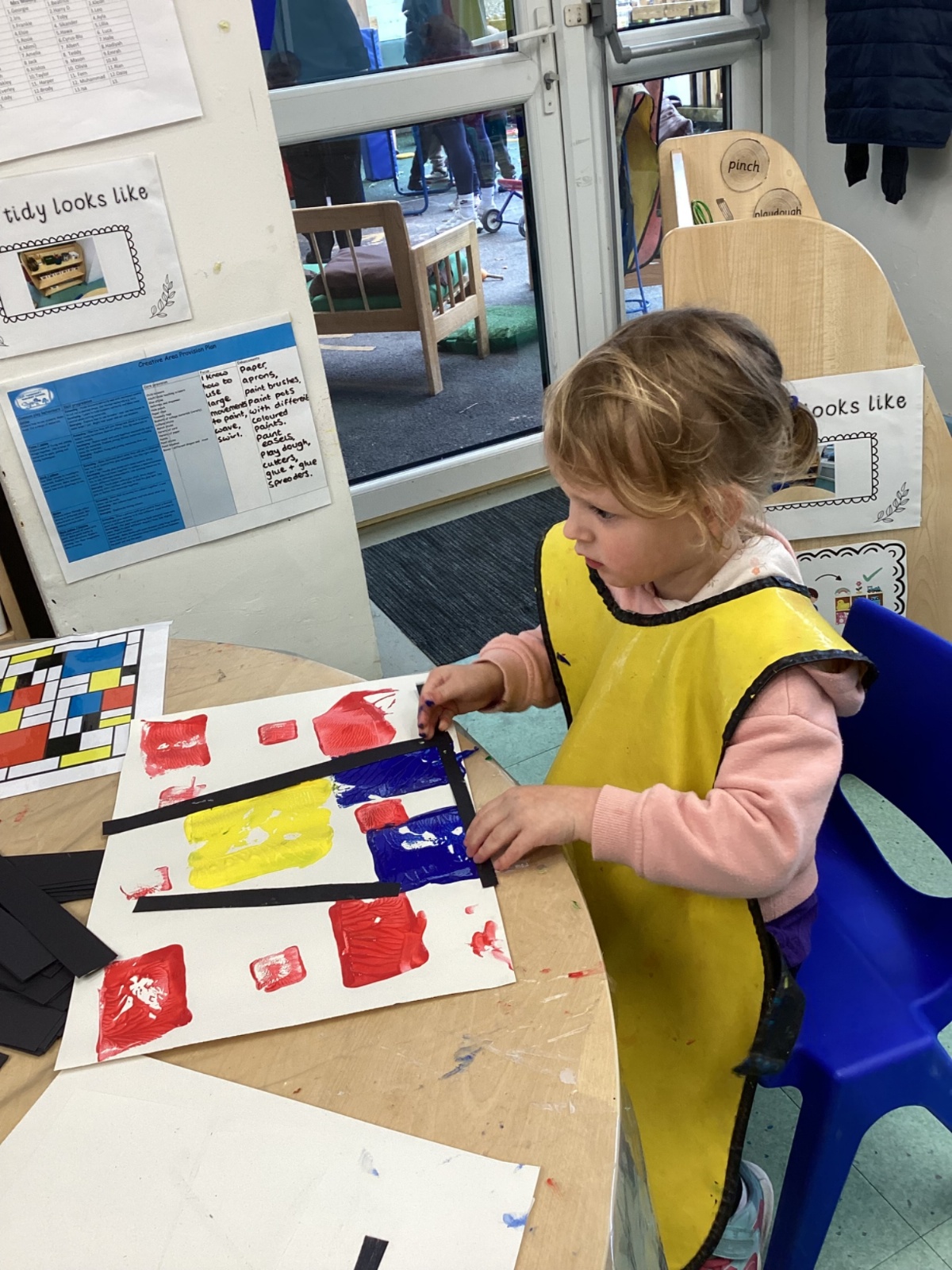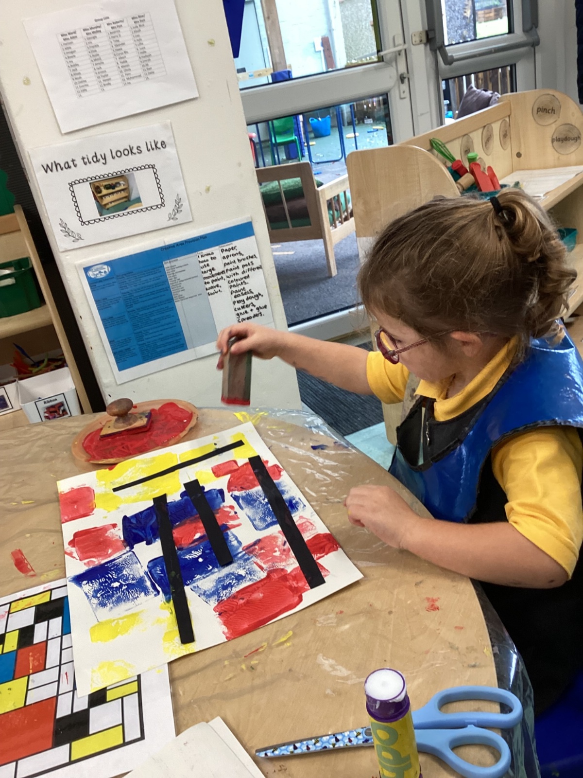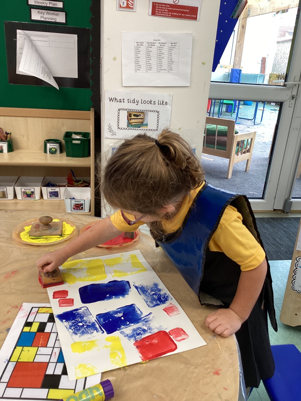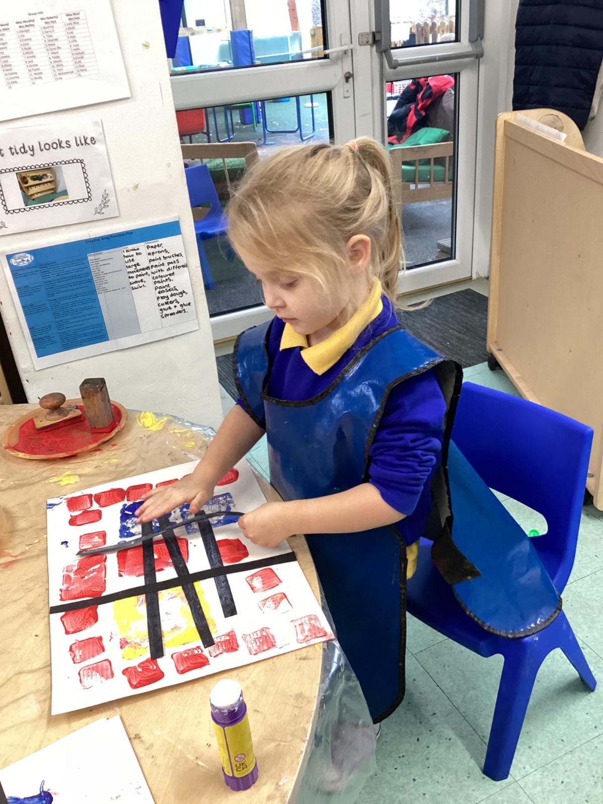 This week in nursery, we have been exploring the work of the famous artist Piet Mondrian! The children have been learning all about the primary colours, red, blue, and yellow and using them in their own creative artwork. We had lots of fun printing with squares and rectangles using paint. We also recreated Mondrian-inspired pieces using black lines and wax crayons. The children loved experimenting with shapes and colours and lines using a variety of different mark-making materials and tools.