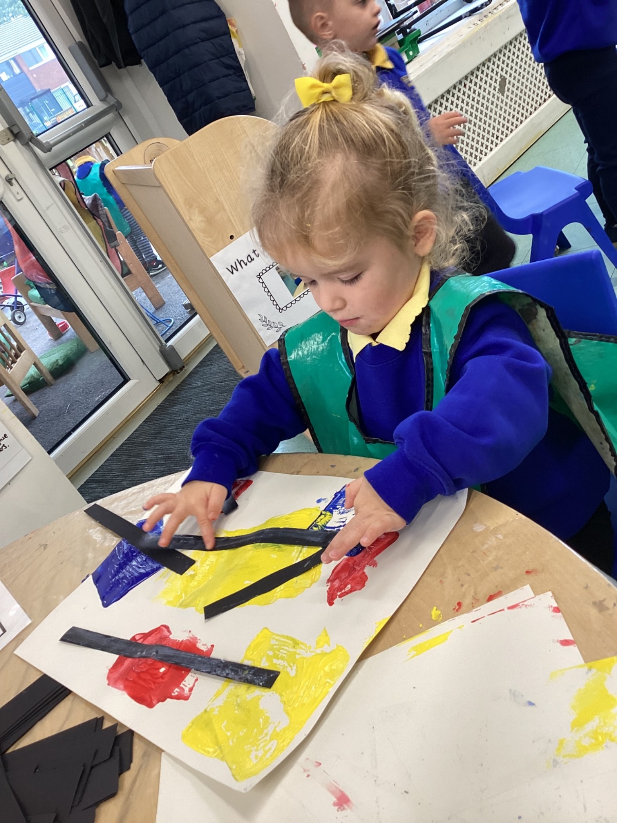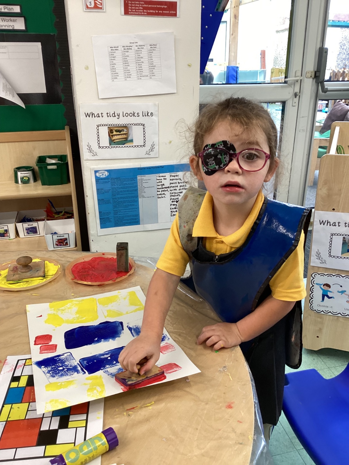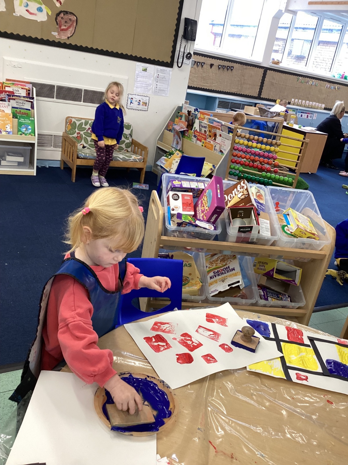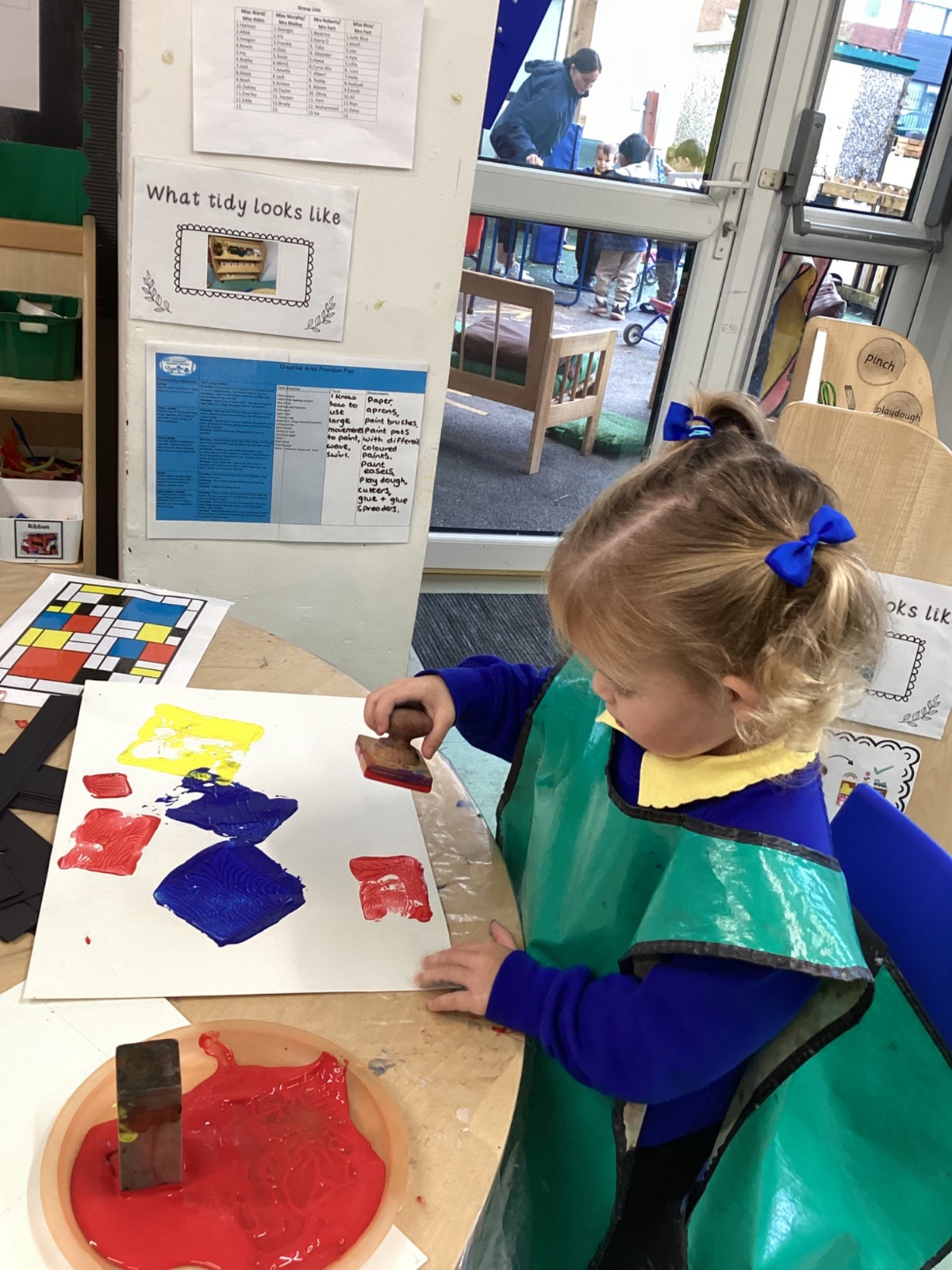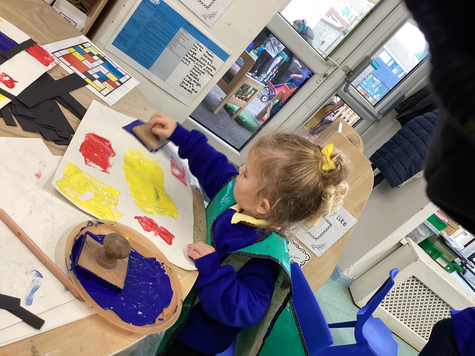 This week in nursery, we have been exploring the work of the famous artist Piet Mondrian! The children have been learning all about the primary colours, red, blue, and yellow and using them in their own creative artwork. We had lots of fun printing with squares and rectangles using paint. We also recreated Mondrian-inspired pieces using black lines and wax crayons. The children loved experimenting with shapes and colours and lines using a variety of different mark-making materials and tools.